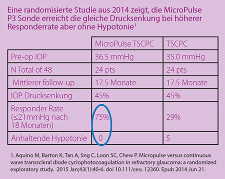 Der Einsatz dieser neuen MicroPulse® Lasertherapie ist daher nicht mehr nur für refraktäre Glaukome oder End-Stage Glaukome interessant, wie bisher bei der konventionellen CW-ZPK, sondern ermöglicht, so glauben wir, auch den sicheren Einsatz als primäre nicht inzisale Therapie. Sinnvoll ist die MP-ZPK auch als begleitende Maßnahme, wenn nach chirurgischen Interventionen, der erwünschte Zieldruck nicht erreicht wurde. Zudem hält der Anwender sich alle weiteren chirurgischen und medikamentösen Behandlungsoptionen ohne Einschränkung offen.